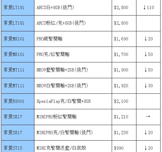 本周索尼爱立信手机跟随主流的降价,多款机型都有不算小的降幅,例如较热门的ST18i有40港元的下滑,目前已经到了一个非常实惠的价位,在千元级手机中有较强的竞争力。而前热门高端机LT18i又有猛跌,下降额度在一百港元左右,保持吸引力。如此的态势,估计将会让索爱慢慢暗淡下去,喜欢的朋友不妨在它们远去之前再追逐一番。