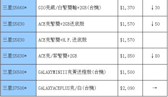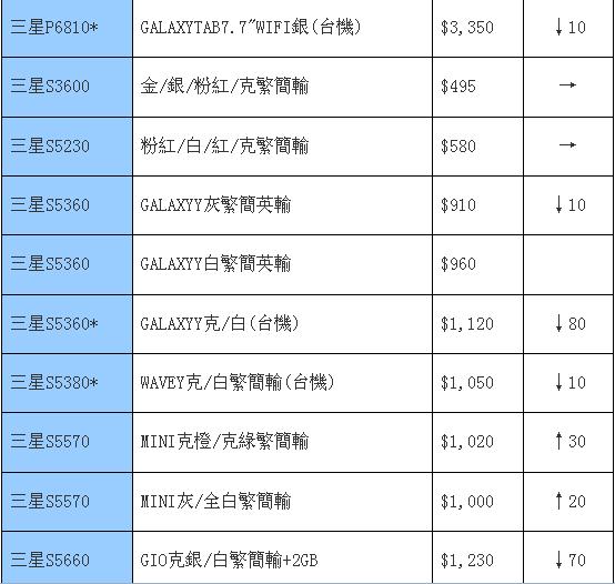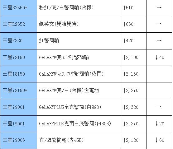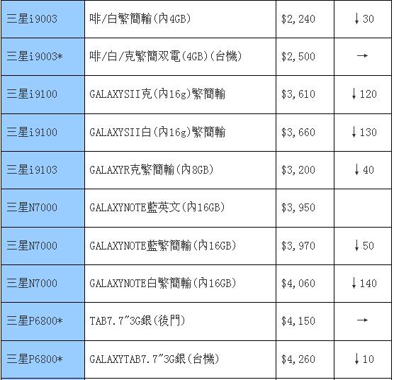 目前的主流仍是跌,本周的三星也不玩主流了,跟着大家一起跌吧。自从巨屏机型出现后,三星也少有更加热门的手机出现,只有最近的Galaxy Ace Plus和Galaxy Y Dous这两款比较有看头之外,其余机型也没有特别抢眼,似乎新鲜血液还不够多。其它旧款的热门机型也只能以降价换取吸引力、以跳水来争夺观众的眼球,例如大热的i9100在两周后的今天也往下跳了一百多港元,依旧有热度的Galaxy Note也有同样的降价额度,值得大家继续关注。