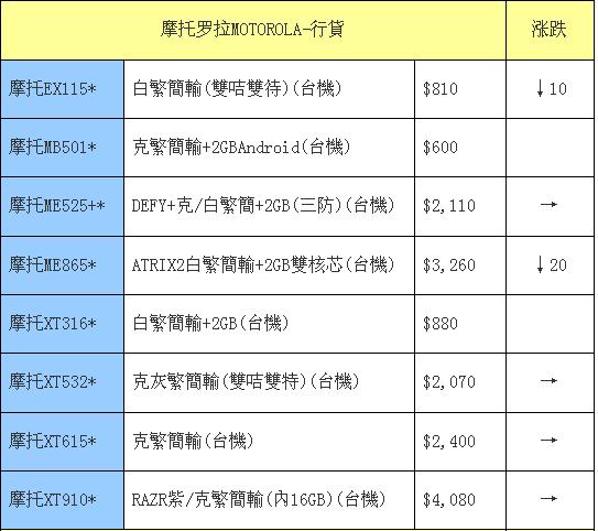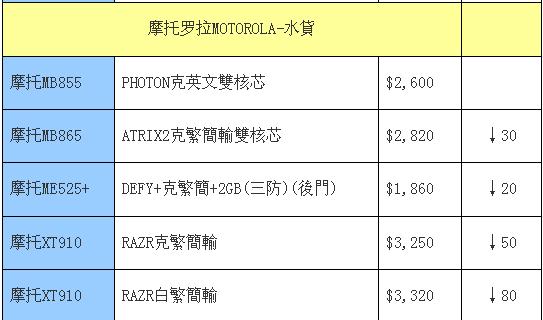 摩托罗拉近期还是没有特别抢眼的新机出现,依旧靠着最薄的XT910撑场面,但是这款机型目前也只能以持续下降来hold住大家。新款薄机XT615行货稳定,但是硬件性能较低也是这款机型不够热的一个原因。至于双核和三防等经典靓机也同样保持小降幅。