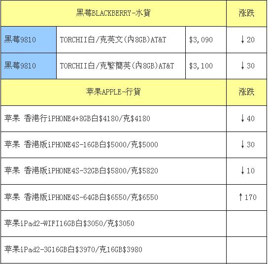 2012年4月7日香港手机报价:先达作为香港的水货手机圣地,同时也销售港行和后行,后行是指撕了保修标签的行货,花100元左右买一个标签贴上去就和行货无异了,而且能得到保修。我们为各位提供的是先达商家拿货的上层报价单,而这份报价单来自先达批货上层,可以说整个中国大陆从香港拿的货价格和这个报价单差异不大,绝对权威。
