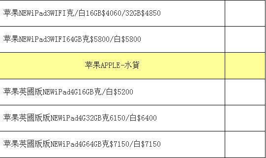苹果的iPhone手机依旧非常热,随着Apple Store有了充足的货源,手机卖场的存货也不得不以低于官方价格出售。但4S的64GB版本却有所回升。另外,卖场内的新iPad也进入了低价位,最便宜的16G版本售价仅比官方贵不到两百港元,有一定吸引力。虽说新iPad有强效发热的功力,但一般也只有在运行高分辨率的游戏下才会有高发热,普通的上网和影视欣赏还是相当不错的。