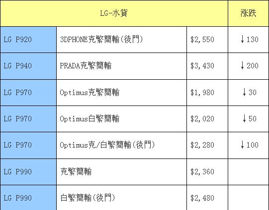 LG手机的新款产品不止为何悄无声息,报价依旧只有这几位老顾客。时隔两个星期,跌价王LG P940再有200港元的下跌,相当有诱惑力,这款机型除了屏幕分辨率略小于同类型的qHD之外,其它方面都非常出色,是时尚用户的不错之选。