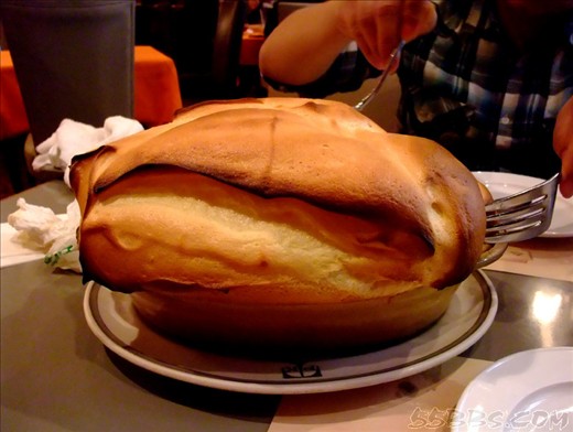 这个蛋糕焗好出來闻起来很香,看着也很巨大,不过拿着刀叉掀开表皮之后,你会发现奥秘,原来这个大蛋糕不是实心的。
