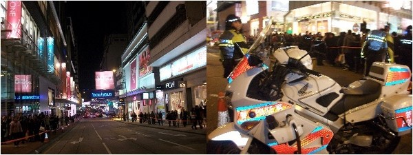 因为内地过去好多游客,导致尖沙咀封路,不过也因为如此,阿sir们都出来维护治安啊,哈哈,我终于见到活的阿sir啦,可惜拍虚了,阿sir的警车比较抢镜啊,帅气!