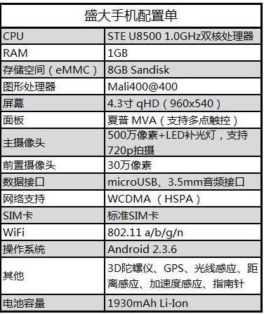 至于盛大手机所采用的处理器,则是ST-Ericsson U8500双核处理器(ARM Cortex-A9架构),并搭配Mali400图形处理芯片。