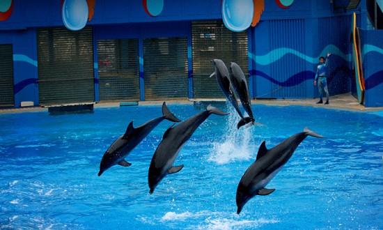 香港海洋公园海洋世界里面海豚腾空跳跃