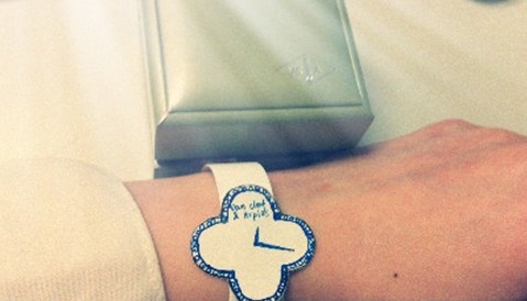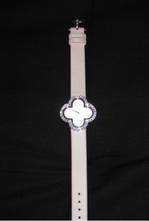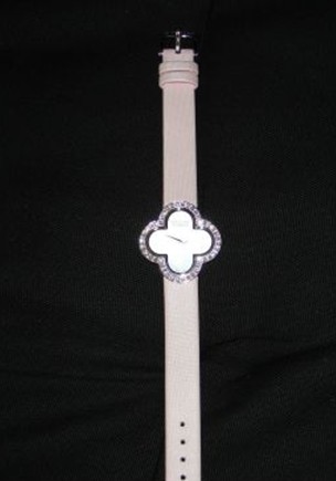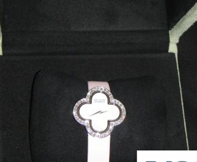 VCA四叶草钻表! 干净大气的白贝母表盘+18K白金表壳+VCA鼎鼎大名的完美闪亮钻石+淡粉色绢丝表带=象征着幸福的VCA四叶草钻表!看到它的一瞬间,心里有个声音在大声呼喊:就是它了!!!