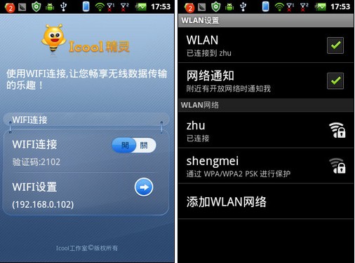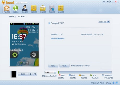 以往我们在PC端管理智能手机的应用、资料时都需要借助第三方软件,此次,酷派7019内置了名为Icool的软件,当手机与电脑相连的时候便会提示是否安装Icool软件,笔者抱着试试的心态安装成功,并分别通过Wi-Fi、数据线两种连接方式与电脑相连,在经过初步的试用后,发现它在功能、使用便捷程度上并不输给目前较主流的第三方平台管理软件。