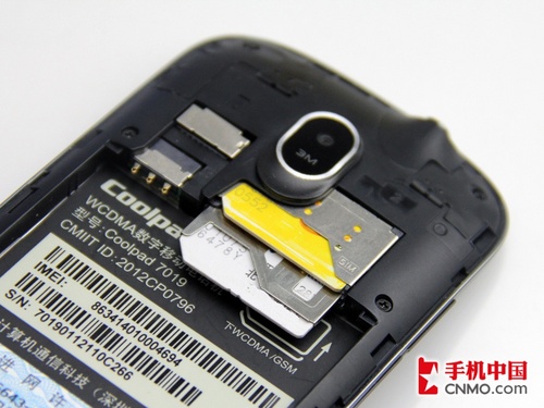 酷派7019的最大卖点还是其双网双待功能,支持GSM及WCDMA网络,它并没有采用传统的并列双卡槽设计,而是将两个卡槽合为一体,通过“SIM卡抽屉”来安装两张SIM卡。