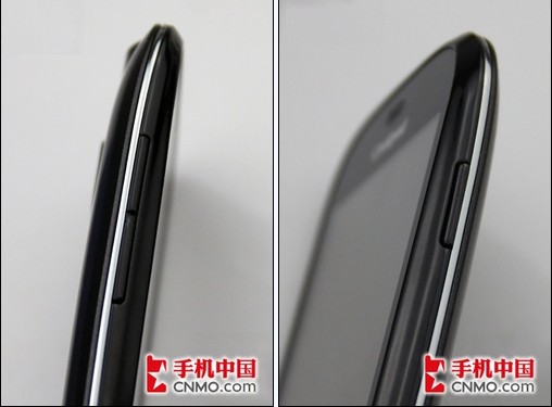 从下面这两张图我们也能够很直观的看出酷派7019的机身采用了超薄设计,并且该机一周都采用了银边的包裹。机身左侧是音量调节键,而右侧是开关机及锁屏按键。