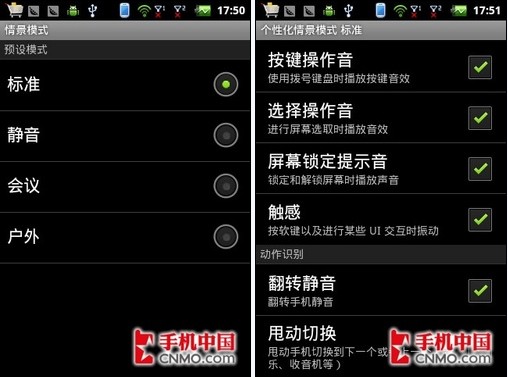 目前,很多采用Android系统的智能手机似乎并没有内置的情景模式选择功能,只是简单的用音量调节键选择无声模式,不过酷派7019却带有了四种情景模式,我们可对四种模式进行设置。同时,该机还带有翻转静音和甩动切换歌曲的功能,这两个功能在笔者使用过程中还是很实用的。