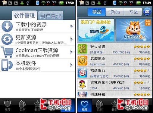 除了沃商店外,我们还可在Coolmart中下载专门为酷派7019适配的游戏及应用软件。Coolmart将软件按照热度、新上架、下载次数等排列,并且通过Coolmart还可对手机中已安装的软件进行升级。