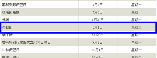 ·2012香港地区五一放假安排: