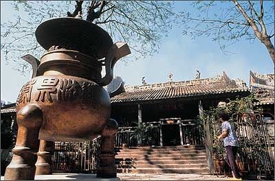 我信步下山,来到南麓的观音堂。它原名普济禅院,有近400年的历史,是澳门最大的禅院,“普济寻幽”当之无愧成为澳门八景之四。从外观看,禅院墙顶、屋桅均用琉璃瓦铺砌,正门顶上装饰有奇花、异草、游鱼、祥龙等祥瑞之物。走进院门,是一个宽敞的前院,主体建筑分为三殿,气势雄伟。主殿供奉着三尊金佛像、身长丈八,很有气魄。次殿是长寿佛像,取佛教普渡众生之意。我拾阶而上进入第三殿,只见观音菩萨慈眉善目地端坐在木刻莲花台上,两旁分列着十八罗汉,全身贴金,各自做着一成不变的动作。我身边的一位母亲告诉她10来岁孩子,左边前面的那一尊罗汉是马可·波罗,我闻言不禁好奇地多看了这尊罗汉几眼,它虽然高鼻凹目,但与其它罗汉也无多大差别不知此话是否属实。倘若是真的,这位意大利旅行家千里迢迢来到中国,居然在澳门受人顶礼膜拜,如地下有知,也当聊以自慰了。