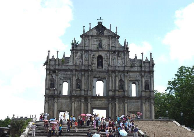 从柿山大炮台往西走,很快就看到澳门的标志——大三巴牌坊。它实际上是对保罗教学在1835年因大火烧毁后残锱上的石砌前壁,我曾在影片《大辨子的诱惑》中见过,影片中宁静扮演的卖水少女在牌坊前舞狮。我原以为牌坊体积很大很壮观,结果亲眼一看,正面倒是高大,侧面却只有薄薄的一层,不过这高高细细的门脸历经百年风雨而不倒,也堪称奇迹了。