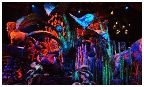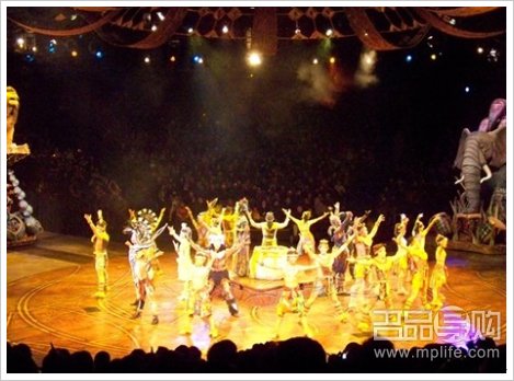 这出音乐剧的故事情节和电影《狮子王》如出一撤,讲述一只天真无邪的小狮子辛巴的故事。辛巴日夜向往成为狮子王,他历尽所有苦难和磨练,从中学会了人生道理,最后成为领土上的狮子王。不过,看音乐剧的震撼感是与看电影是截然不同的哦~在表演场地有一个圆形的舞台,听旁边的观众介绍,此灵感来自非洲中部及西部的大型会堂。四周分别有四个巨型的舞台(有辛巴坐在荣耀石上;大象和转动的树干;一头摇摆的长颈鹿;还有彭彭和丁满)从两个不同的方向进入场地,同一时间,盛装的表演者连同色彩缤纷的道具在观众席的上空飞翔。不由的会发出“哇~~”的感叹声呢~~
