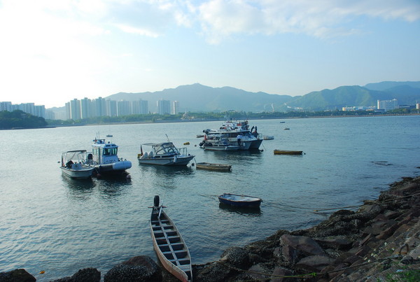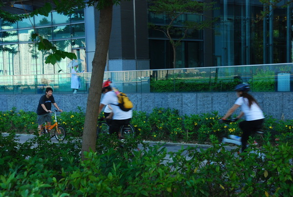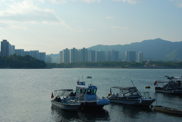 于是我四点十分出发了。貌似是个28速或者24速的山地变速车,新车很轻,但是没减震。除了大围就是往沙田的方向走,这一段路是沿着城门河走(我记得是这个名字),单车径都在河边,可以一直骑到入海口附近。这一段路上若干休息点,路标也很清晰。貌似还经过了沙田马场(我后来看地图发现的)。在入海口附近有岔路口,大埔就左转了。