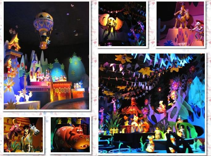 买票排非常非常非常长的队,想去的一定要上网先买好票。进园先楞了一下,迷糊忘带迪斯尼攻略了-0-~拿小手册研究了一下,决定先去明日世界拿FASTPASS(是这么拼么?忘了,就是预定时间,到时间后不用排队直接进去玩的那个票票),拿完正好看1点的花车游行。我们拿好飞越太空山的FASTPASS后,不知不觉转进了小小世界。