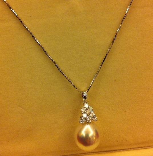 我的铂金珍珠项链,折后1W7+ HKD 。这颗是粉紫色的珠皮,不是正圆却比同样大小正圆的白色珍珠要贵。个子高的MM戴椭圆珍珠会更好看哦~