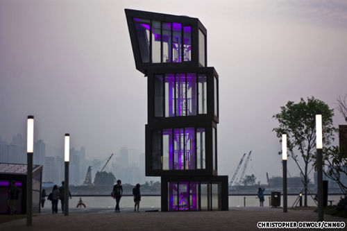 前身为货柜码头,近期经改建后的海滨长廊更以过去堆叠在货柜场的压缩回收纸堆作为地标新塔的灵感。