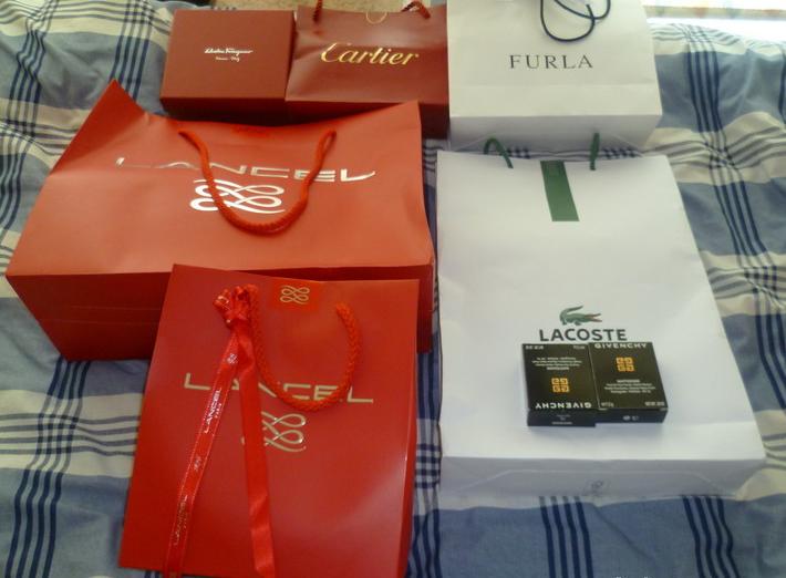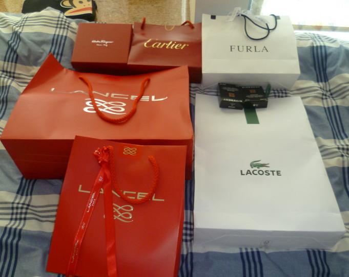 实在抱歉,不会一张图一个价格那样写,直接写在这里,大家参考一下,LANCEL的东东在那边比较合算,刷银联卡打9折,再合算汇率比国内便宜不少,红色钱包是3350HK,合人民币2460左右,红色挎包国内2990,那边1723拿下。FERRAGAMO是2850HK,合人民币2322,FURLA的钱包是1950HK,人民币1625元,CARTIER对戒男款是宽版,11200HK(有点不准确,记不清了,但差的不多),女款窄版,6950HK,两个加一起合人民币15000。LACOSTE的衣服1750HK,和人民1425,比国内便宜哦~~~白的LANCEL包是满够5000HK送的,店员说价值1990HK。