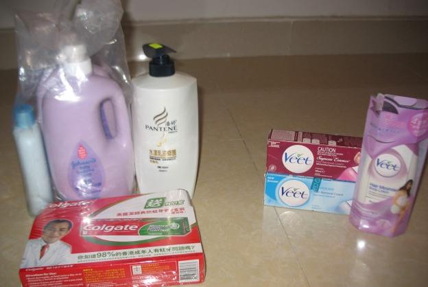 左边的是在药房买的,潘婷48元1000ML;浴液62元3瓶2大1000ML+1小300ML;高露洁25元2大250ML+1小100ML。