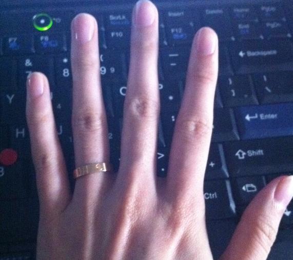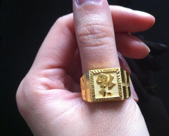 老公买了个15克的大戒指。。。呵呵。。。虽然很俗气根本没办法带出去,但是偶尔在家里带带也挺好玩的,再带个蛤蟆镜,叼根烟,脖子上再带跟金链子,胳膊上再左青龙右白虎。。哈哈。。。。。