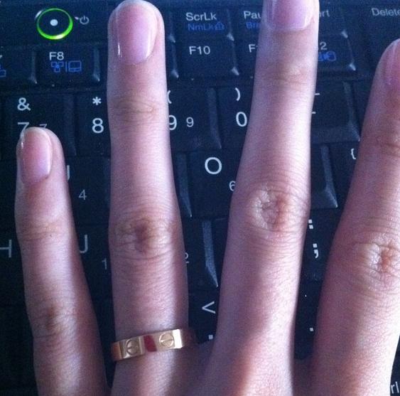 对戒love系列窄版玫瑰金,购于海港城卡地亚,6950*2港币,比国内便宜很多,划算。