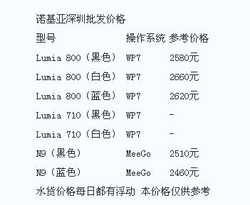 与摩托罗拉一样,“沉稳”的诺基亚报价也终于有所松动。其中,降幅最为明显的就是采用WP7系统的旗舰机型Lumia 800,相比上月末,它整整下跌了200元,不过与其出自同门的Lumia 710却出现了缺货现象。而采用MeeGo系统的N9也有了小幅下跌,但与Lumia 800相比却有不小的差距。总体来看,诺基亚热门机型的平均降幅达到了120元,价格已经十分实惠。