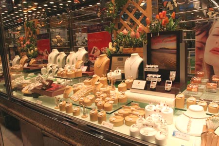 闪烁生辉、耀目无比的钻饰,是女士们的至爱。走在香港的街上,游客一定会为珠宝店橱窗内陈列的珠宝而驻足。香港的钻饰和金饰设计新颖、做工精细,而且价格合 理,从传统款式以至最新流行的卡通人物具备,肯定适合不同年龄的人士。玉器被中国人喻为有辟邪和定惊的作用。选择玉器时,以色泽均衡、晶莹通透和触手冰凉 为佳。购买玉器时,发票上应清楚注明该玉器的种类和来源地。如欲购买贵重的玉器,宜与行内人士一同前往选购。珍珠以光泽、大小和折光度定优劣。钻石则因其 重量、颜色、通透度和切割而价格各异。在香港,手表的款式多得令人眼花缭乱,从港币几十万元一块的名贵手表到几百元的运动表,甚至几十元一块的时装表,供 游客尽情挑选。铜锣湾怡和街、轩尼诗道、旺角弥敦道、荃湾珠宝金饰坊都是很好的购物地方。