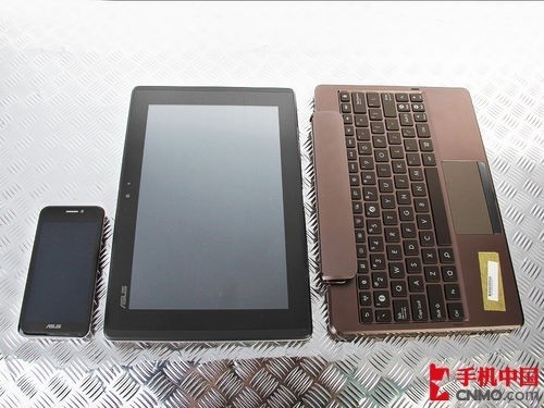 外观方面,华硕PadFone分为三部分。从上图可以直观的看到,最左边的是这款产品的核心,它具有传统手机的外形,同样是采用最经典的直板触控设计。它搭载一块4.3英寸Super AMOLED材质的电容触控屏,分辨率达到960×540像素级别,屏幕显示十分清晰。在其背面则是搭载一枚800万像素摄像头,支持自动对焦等功能,成像效果极佳。中间部分是一个平板基座,它具有10.1英寸的超大屏幕,背后搭载800万像素的摄像头。不仅如此,这个平板基座还内置一块6600mAh的锂电池,有效保障了此设备的续航能力。最右边是一个外接键盘,三部分组装到一起就是一个小型笔记本电脑。