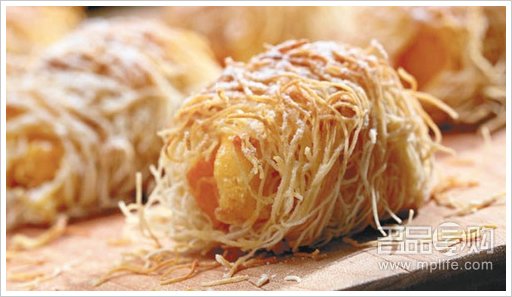 甜品杧果面丝卷(Kataifi)其实是以中东面条包裹着杧果条、软滑忌廉和海绵蛋糕,外脆内软,口感极佳。