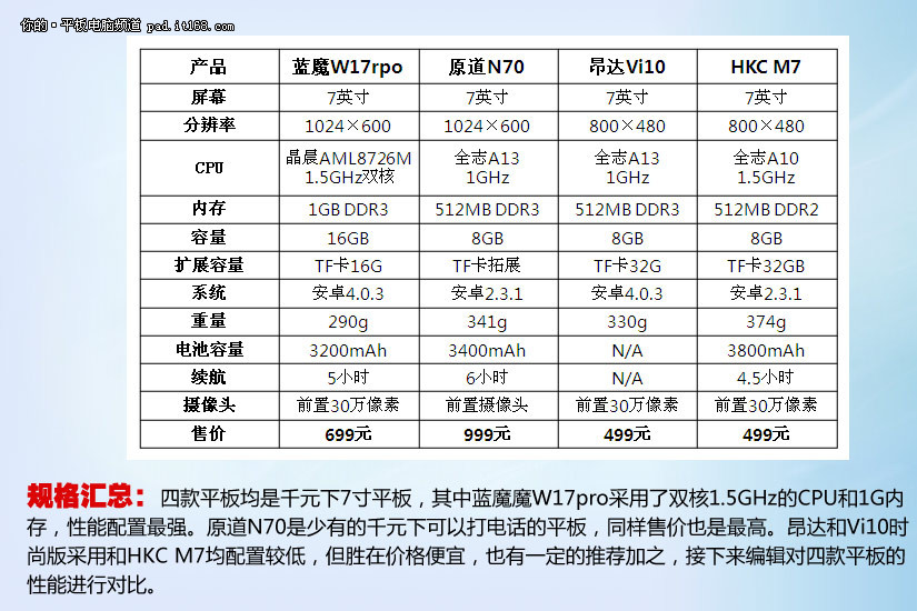 4款千元内7寸安卓平板规格配置表