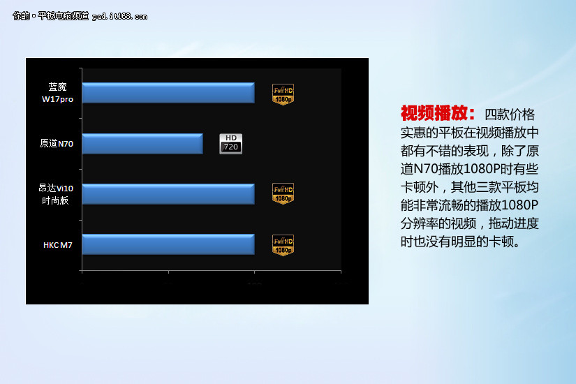 除了原道N70之外,其它三款平板均可流畅播放1080P分辨率的视频。