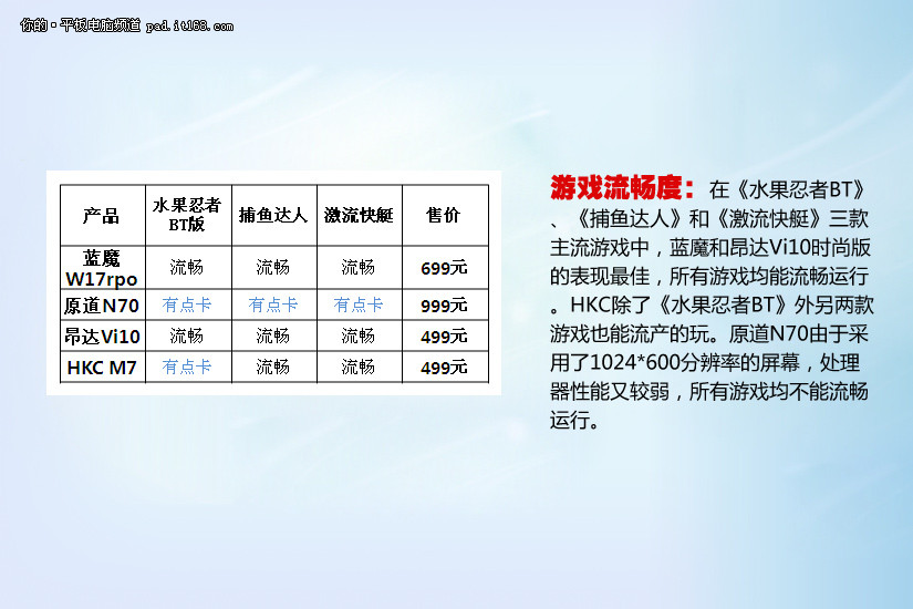 在《水果忍者BT》、《捕鱼达人》和《激流快艇》三款主流游戏中,蓝魔和昂达Vi10时尚版的表现最佳,所有游戏均能流畅运行。HKC除了《水果忍者BT》外另两款游戏也能流产的玩。原道N70由于采用了1024*600分辨率的屏幕,处理器性能又较弱,所有游戏均不能流畅运行。