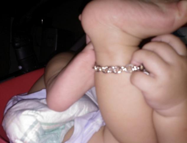 在哪呢,怎么没看到啊~?嘻嘻。。。。原来挂在了小宝的脚上~看图!