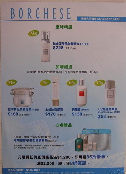 NO.8贝佳斯 BORGHESE门可罗雀呀!!实在是这个牌子平时在SASA卓悦里卖白菜价卖的太多了,这专柜打4折5折还是吸引不了几个人呀~~尤其是那些泥还都是小罐的