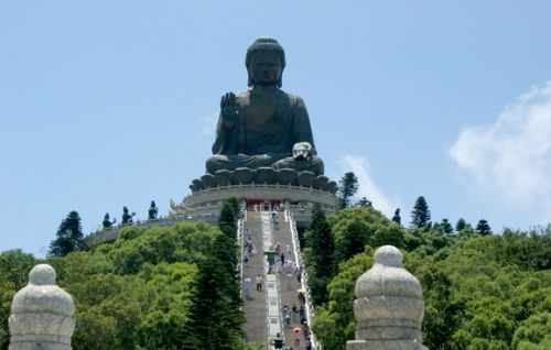 天坛大佛坐落在香港大屿山木鱼峰顶,是当今世界上最大露天青铜坐像。佛像身高23米,连莲花座及基座总高约34米。重250吨,由202块青铜焊接而成。重5吨的佛面,在浇注时加入约2千克黄金,更添光彩。