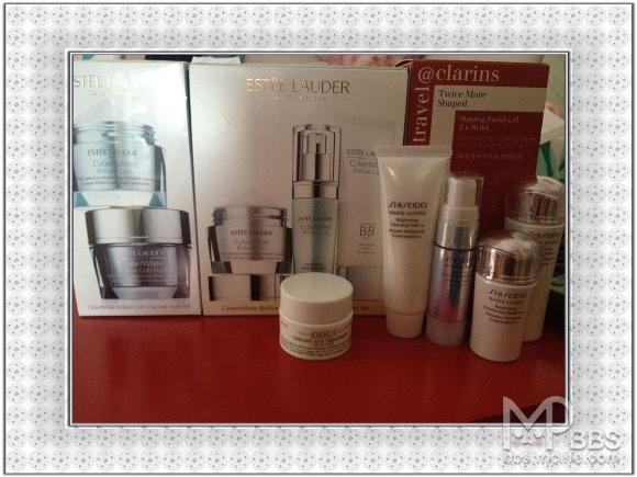 左边是妈妈的日霜晚霜~~中间的是我的~BB霜已经开始用了感觉还不错,一个牛油果眼霜~送了一套资生堂的小样~还有一个lancome的小蓝瓶精华液已经开始用了就没拍~~~