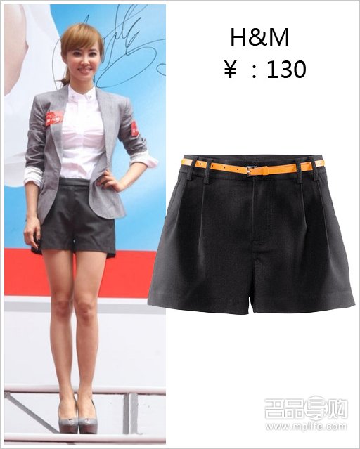 蔡依林的黑色短裤搭配西服白衬衫,打破了沉闷感,露出腿部,显得青春靓丽。