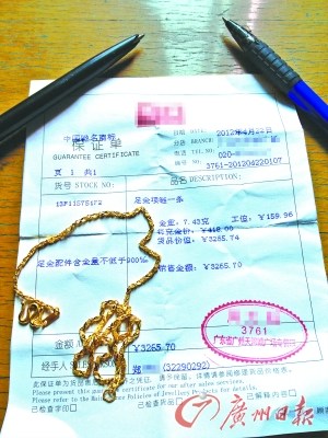××福出具的这张保证单上,记者还看到下列字样:足金配件含金量不低于90%,即他们只保证90%以上的含金量,是不是真的达到其口头所言的香港品质999.9就不在此保证之列了。