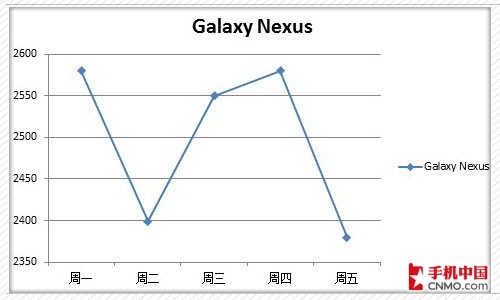 Galaxy Nexus是谷歌的第三代产品,它可以说是“混血儿”,骨子里属于谷歌,但由三星代工“抚养长大”,所以外观上看也颇具三星Galaxy系列风格。这款手机相对于其他机型更具有优势,这种优势则体现在系统权限升级方面,每当谷歌发布最新操作系统或者软件应用,Galaxy Nexus都能率先体验到。价格而言,从下面走势图我们看出,本周走势并不算顺利,有升有降,截至周末售价已经跌至2380元。