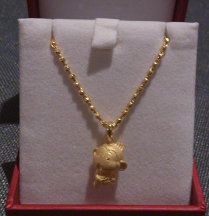 一直以来,我都特想要个属相的黄金坠坠,所以在去之前,就打算要把这个属相黄金坠坠拿下,去之间也做了功课,抄了个卡号,结果后来没用上,怪我没记性,忘记了,唉~~满大街一眼望去,都是周大福啊,周生生啊,可我比较钟情于周大福,而且觉得周大福的属相坠还蛮好看的,我和老公进了第一家,没有我想要的款,出来我就跟老公说,见到周大福就进,刚说完,一转弯,就有一家就进去了,也没多想什么,买完出来才觉得这家店好小哦(这都是后话了),进入简单明了,直奔生肖,摆着的没有,又让我看电脑里显示出的图案,我把事先从网上找到的拍好图片放到手机中,这样,手机图片和电脑一对比,对上了,就是它了,然后就开始等,等了大概10分钟,生肖拿来了,又挑了条链子,等的功夫,就开始问,有没有优惠啊之类的,销售是个年龄不小的老女人了,说你刷银联吧,刷银联有个85折,我就问,不对啊,应该还能再低吧,她说,不能了不会了,唉,当时我就犯傻了,忘了那个抄的卡号了,可当想起时,也不好意思在拿出来了,结果,最后砍到8折手工费把链子和坠拿下。