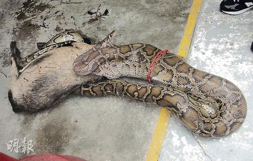 其间蟒蛇疑因受惊,张口慢慢把小羔羊全只吐出,但小羊已返魂乏术。院长其后通知渔护署及报警。约下午12时,水警轮载着“蛇王”到场,把巨蟒放入布袋,稍后送往渔护署动物管理中心检查,视乎其健康状况决定会否放回野外。
