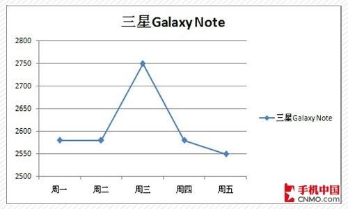 无论现在核心大战多么激烈,三星Galaxy Note总是占有一席之地,这得益于它5.3英寸的巨屏,这款跨界手机在视频和游戏方面有着得天独厚的优势。毕竟对于消费者,智能手机的很大一部分功能就是游戏和视频,它也顺应了市场需求。从下图我们可以看出,目前这款Galaxy Note价格非常稳定,从周一的2580元到周五的2550元,价格浮动不大。