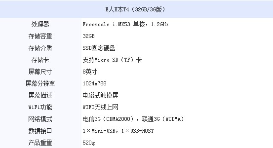 配置方面,E人E本T4平板电脑搭载了Freescale i.MX53 单核处理器,支持Micro SD(TF)卡,支持WIFI和3G两种上网模式,32GB固态硬盘,配有Mini-USB接口。并预装安卓操作系统。