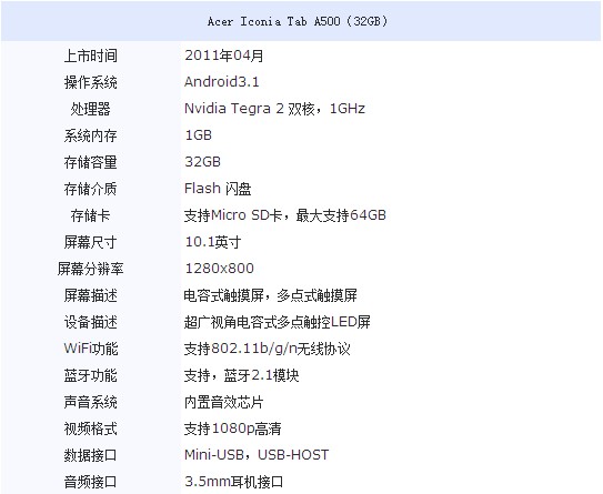 配置方面,A500采用Android3.1的操作系统,NVIDIA Tegra 2 高达1GHz的双核处理器,屏幕分辨率是1280x800 并且配备双摄像头给爱自拍的你提供了臭美的机会。