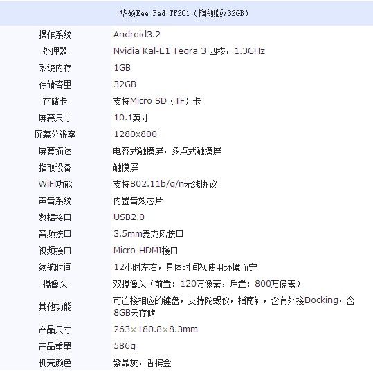 配置方面,华硕TF201旗舰版平板电脑搭载了全新的Tegra 3 四核处理器,1GB内存和32GB的存储容量,还支持SD卡扩容。支持蓝牙,配有USB 2.0接口,拥有120万和800万像素的前后双摄像头。并预装安卓3.2操作系统。