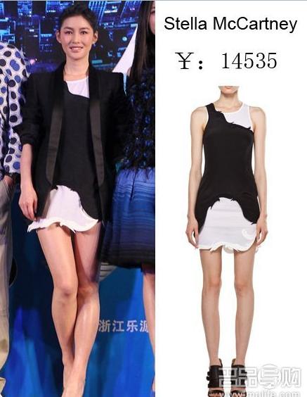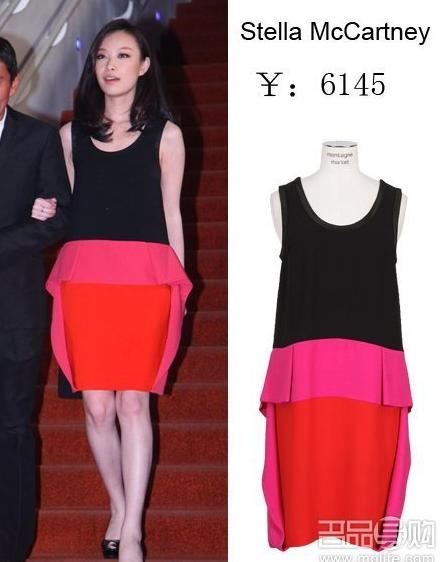 倪妮的这条拼接连衣裙非常抢眼,搭配黑色的鱼嘴高跟鞋ok!