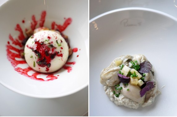Pierre 餐厅的菜式被形容为:“充满诗意,且具田园风味…美得像中国水墨画、秋意正浓的浪漫景致,或京都古朴的山水庭园。”这在我和友人点的两道前菜中尽显无疑,我盘中的这一道Raw Oyster with fresh ginger, mackerel rillettes, frozen banana; celeriac remoulade with turmeric,现刨开来的生蚝肉由新鲜生姜、冷冻香蕉、和韭黄叶等食材调味,生蚝肉质鲜而肥美,铺垫在一层厚厚的腌制过的鲭鱼泥上,两者交融在一起,味甘鲜美,层层海味迎面扑来。而友人这道Poached eggs, golden chicken liver cake更是色香味俱全的一个慢煮蛋,实乃视觉和味觉的双重享受。